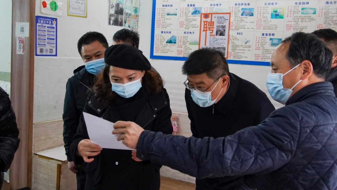 冼薇在鸿山街道检查农村地区疫情防控工作,叮嘱村干部在疫情防控特殊时期要注重劳逸结合,共克时艰。冼薇在旺庄街道群星村,对照人力资源机构纸质台账资料一一核查防疫措施落实情况。