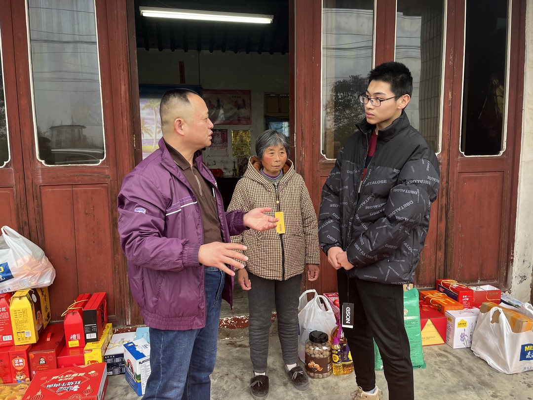 慰问组一行详细了解了茅奶奶的家庭收支情况、身体情况以及家里需要解决的困难。茅奶奶说,谢谢大家又来我家送温暖,现在和孙子一起生活,十几年来一直有各位好心人的帮助,也要感谢党的好政策,现在有农村低保、土地集中流转有补贴收入,能满足维持家庭的日常开销;小毛小病有农村合作医疗医疗,压力也能承担;就盼着孙子茅浩彬的学业有成,走上工作岗位。得知茅浩彬同学春节后开始到十总镇企业实习,江苏一行供应链公司总经理葛吉林当即带小茅同学到骑岸镇上,购买“新大洲”电瓶车一辆赠送。