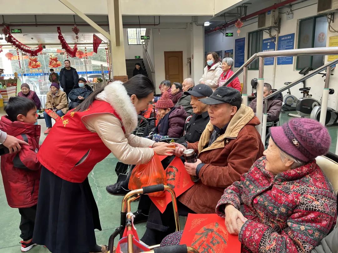 随后,老师和志愿者们把春联和“福”字送到现场每一位老人的手中,并为老人们送上新年的祝福,祝愿他们身体健康、万事如意、龙年吉祥、阖家幸福。老人们拿着老师们用祝福化成年味的春联和“福”字,脸上洋溢出幸福的笑容。整个活动现场温馨喜乐,弥漫着浓浓年味。