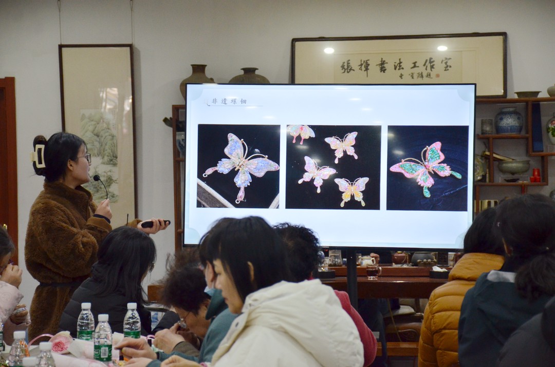 活动在悠扬的古琴韵律中拉开帷幕,老师向大家详细介绍了螺钿技艺这一传承千年的传统工艺,从其历史渊源、发展脉络,到制作流程中的选材、打磨、镶嵌等关键环节,以及独特的艺术特色,都进行了深入浅出的讲解。