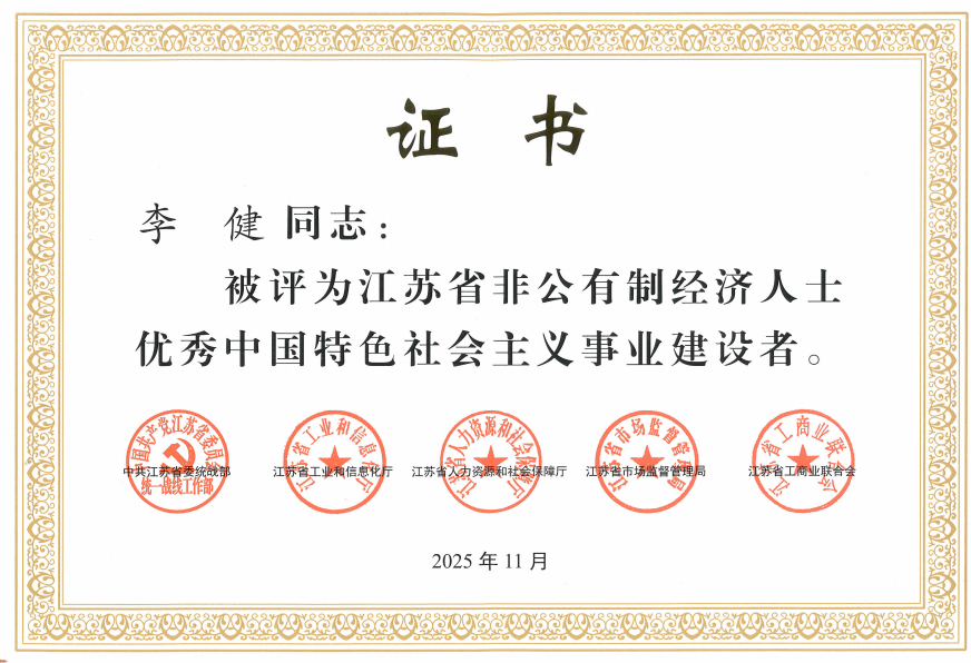 11月6日,在第八届江苏省非公有制经济人士优秀中国特色社会主义事业建设者表彰会议上,民建市委委员、民建新北区基层委员会副主委李健凭借突出贡献光荣上榜,被授予 “江苏省非公有制经济人士优秀中国特色社会主义事业建设者” 称号,展现新时代民建会员积极投身地方经济社会发展的担当与风采。