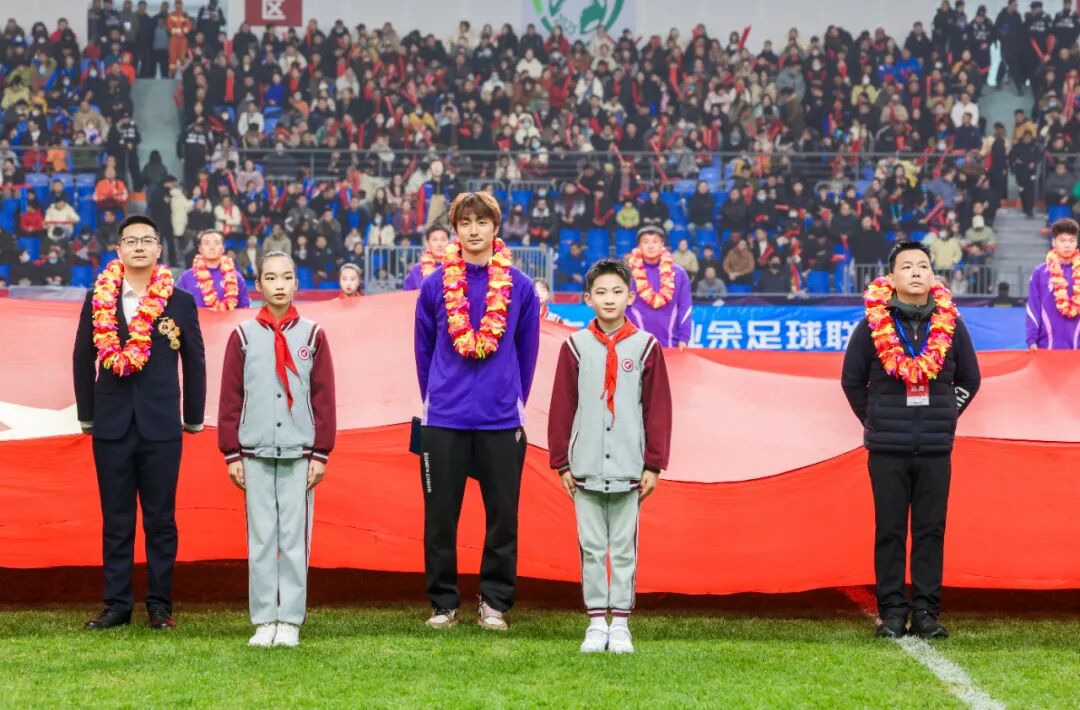 随着《歌唱祖国》旋律响起,旗手们步伐坚定有力,将旗帜稳稳护送至指定位置,全场一同放声高歌,家国深情随旋律流淌,赛场热忱伴歌声飞扬。随后,来自南通市新区小学的小朋友为巨幅国旗护旗手们佩戴花环。