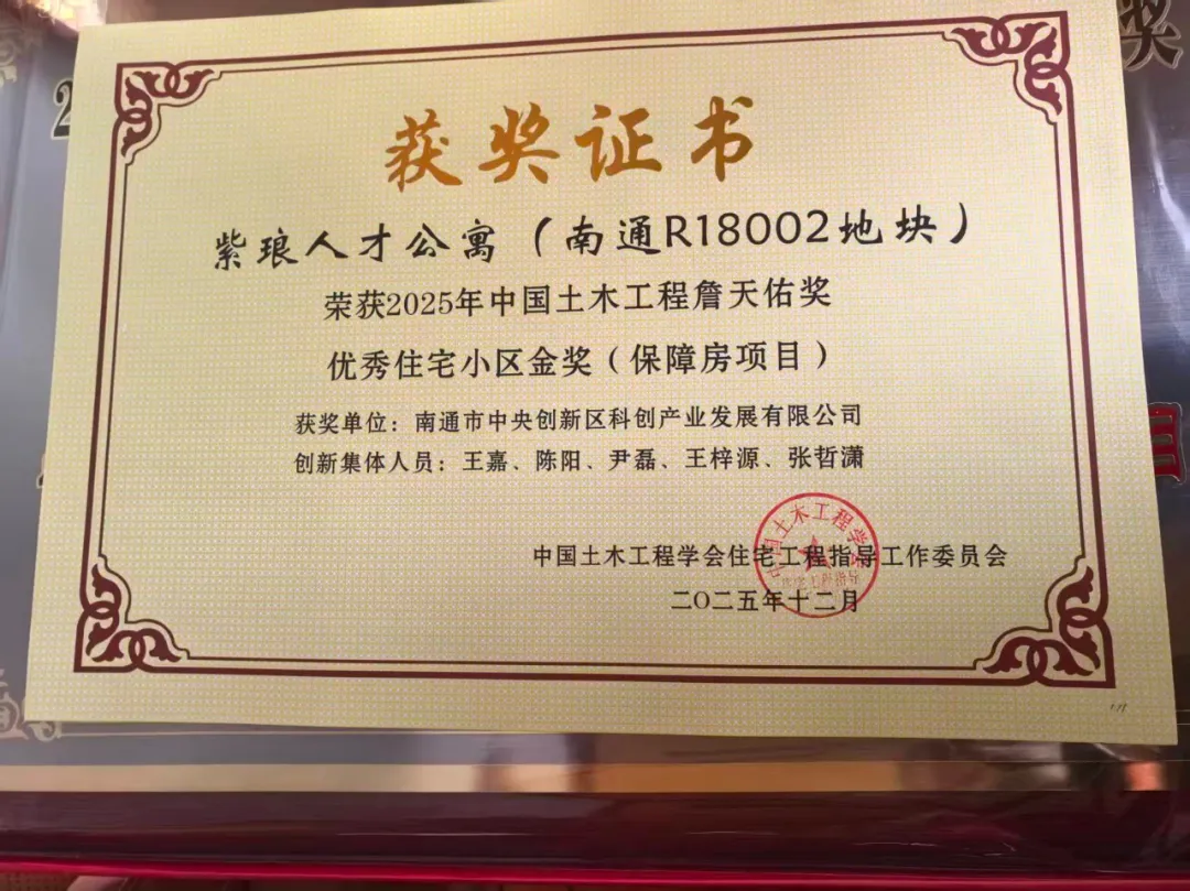 近日,民建南通市委会市直一支部副主委、工程建设委员会秘书长、南通市中央创新区建设投资有限公司风险控制部部长、南通市中央创新区科创产业发展有限公司执行董事陈阳参与的“紫琅人才公寓”项目荣获2025年中国土木工程詹天佑奖“优秀住宅小区金奖”(保障房项目)。