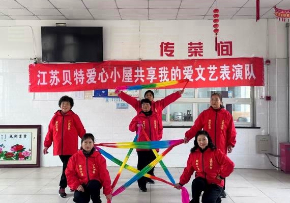慰问期间,会员们会同江苏贝特爱心小屋“共享我的爱”文艺表演队为老人们献上精彩节目。舞飘带《红红火火》舞出了对新年的美好憧憬和对老人们红火生活的祝愿;精心编排的《三句半》表演将敬老爱老的故事娓娓道来;叠罗汉表演《空竹抖起来》充分展现了民间艺术的活力;《东北手拍》互动环节洋溢着欢乐的气氛;气势磅礴的《中国龙舞》将现场的气氛推向高潮。表演最后,大家高唱《没有共产党就没有新中国》,铿锵有力的歌声,唱出了大家对党和国家的深厚情感和共创幸福生活的坚定信心。活动现场欢声笑语不断,让老人们在寒冬中感受到家人般的温暖。