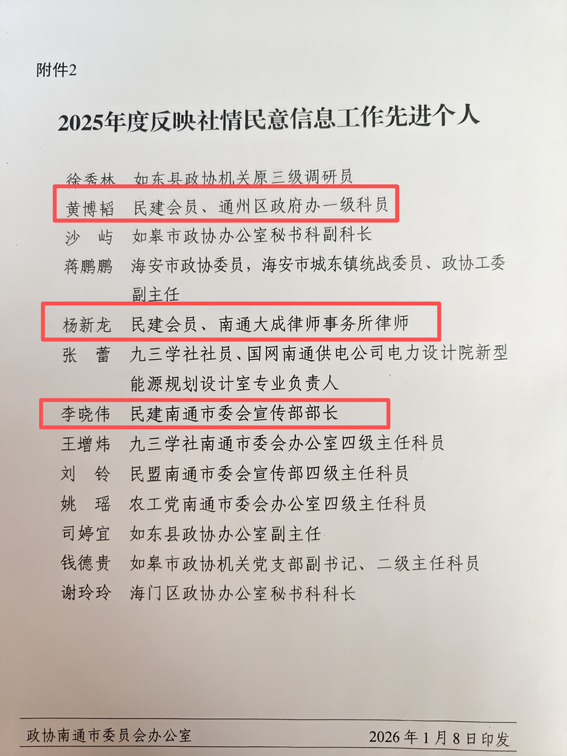 近日,南通市政协对2025年度反映社情民意信息工作先进单位和先进个人进行表扬。民建南通市委会履职量质齐升,获评2025年度反映社情民意信息工作先进单位,黄博韬、杨新龙、李晓伟等三名会员获评2025年度反映社情民意信息工作先进个人。