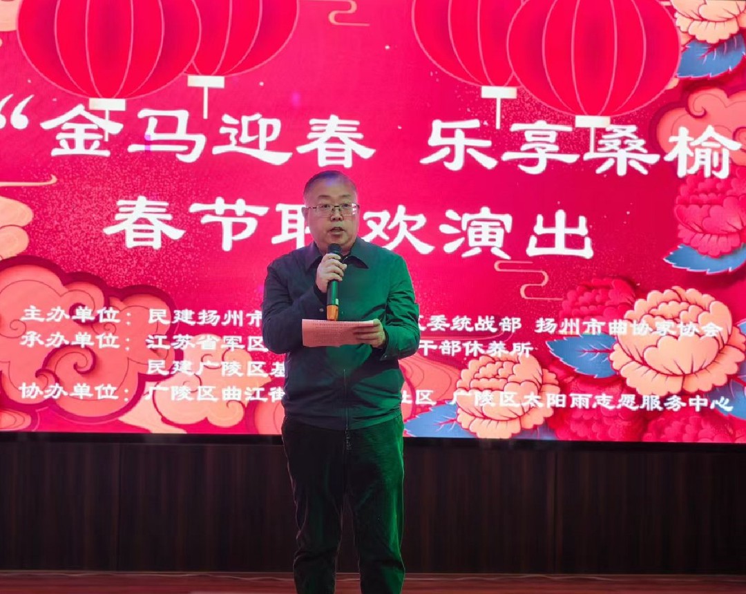 立春好时节,欢聚迎新春。2月4日下午,由民建扬州市委会、中共广陵区委统战部、市曲艺家协会共同主办,江苏省军区扬州第二离职干部休养所和民建广陵区基层委员会联合承办,市少年宫、扬州太阳雨志愿者团队协办的“金马迎春 乐享桑榆”迎新春文艺演出在扬举行。活动旨在营造欢乐祥和的节日氛围,丰富老干部们的精神文化生活,增进工休感情,传递组织温暖。江苏省军区扬州第二离职干部休养所上校政委田亚威,扬州市政协副秘书长、民建扬州市委会专职副主委黄锦山等出席活动并致辞。