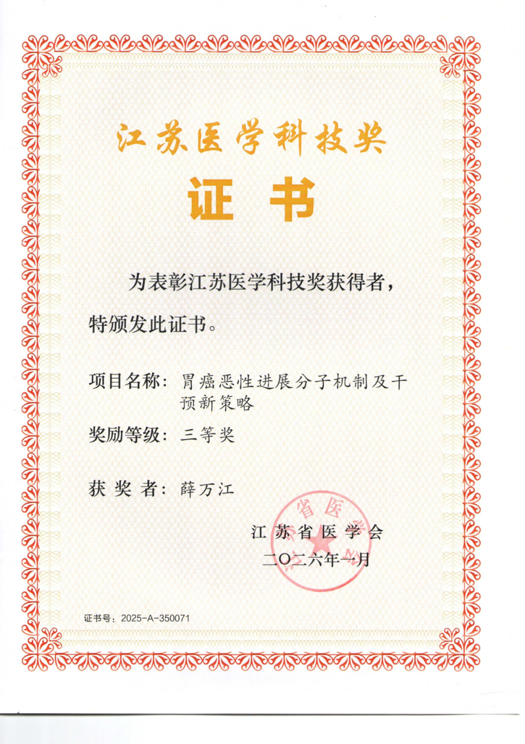 薛万江,胃肠外科主任医师、教授、博导,南通大学医学院副院长、南通大学附属医院胃肠外科学研究所所长、学科建设办公室主任、南通市肿瘤胃肠病学重点实验室主任。江苏省“333人才工程”中青年学术技术带头人、江苏省“科教强卫工程”青年医学重点人才、南通市十四五医学重点人才、南通市医师奖获得者,南通市青年岗位能手。