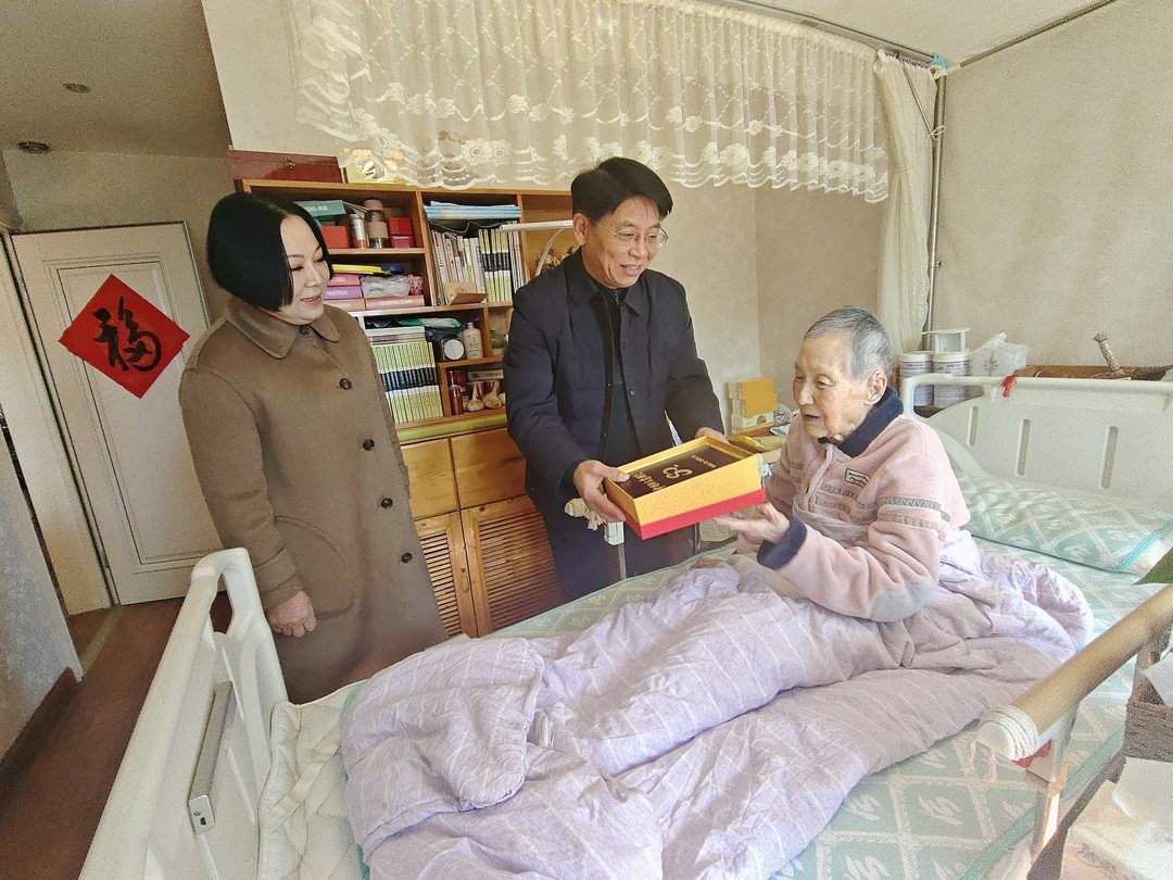 孙统贤看望了1956年入会的百岁老会员翟昌芝,关切询问其生活起居与身体康健情况,并亲手为她颁授“光荣在会50年”纪念章,送上春节祝福。