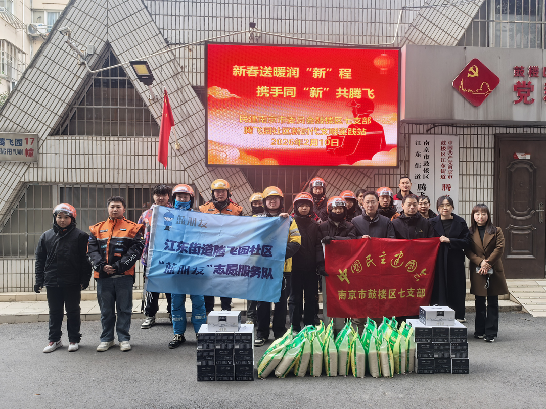 为切实加强对新就业群体的关心关爱,传递社会各界温暖与支持,2026年2月10日下午,民建南京市委会鼓楼区七支部走进腾飞园社区,开展新春走访慰问活动,向仍然忙碌在基层一线的“蓝朋友”志愿服务队送上节日问候与暖心礼包,腾飞园社区党委书记陈奇璠全程陪同。