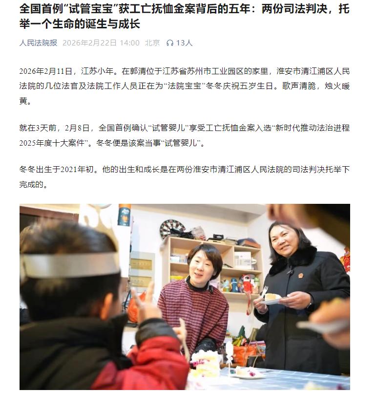 “祝你生日快乐,祝你生日快乐……”2026 年 2 月 11 日,江苏小年的暖光洒满苏州市工业园区的一间普通居民家中。淮安市清江浦区人民法院的法官们围在蛋糕旁,与 “法院宝宝” 冬冬一起吹灭五岁生日的蜡烛。烛火摇曳中,这个活泼爱笑的男孩不会知道,自己的诞生与成长,是两份司法判决用五年时间托举起的法治奇迹。​