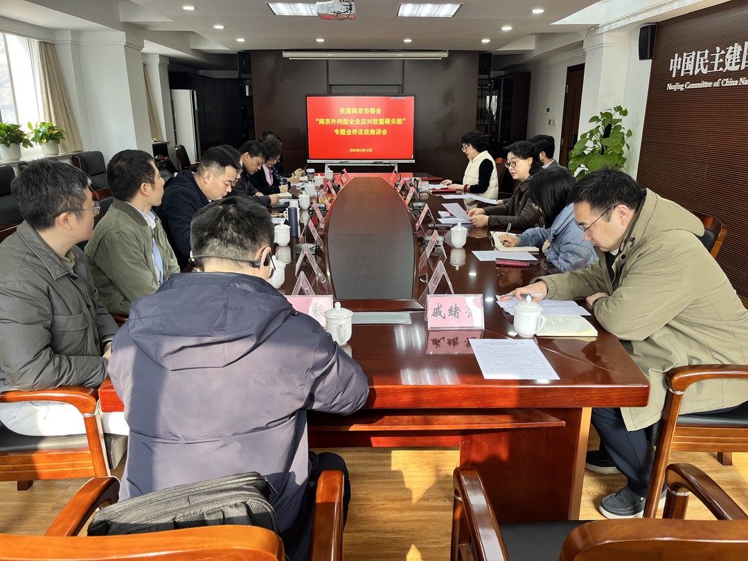 我市外向型企业数量众多、出口规模庞大,其中不少企业深耕欧盟市场,若未能及时有效应对,将直接削弱产品价格竞争力,甚至面临订单流失、市场退出的风险。为进一步厘清企业发展面临的现实痛点,为政策精准赋能提供依据,2026年3月13日,民建南京市委会召开“南京外向型企业应对欧盟碳关税”专题金桥议政座谈会,邀请了会内来自碳来源、碳交易、外贸企业、生产企业等相关行业领域的会员参加,特别邀请了江苏擎天工业互联网有限公司相关业务负责同志座谈交流。市政协副主席、民建市委会主委杨平,民建市委会专职副主委杨卫青出席会议。